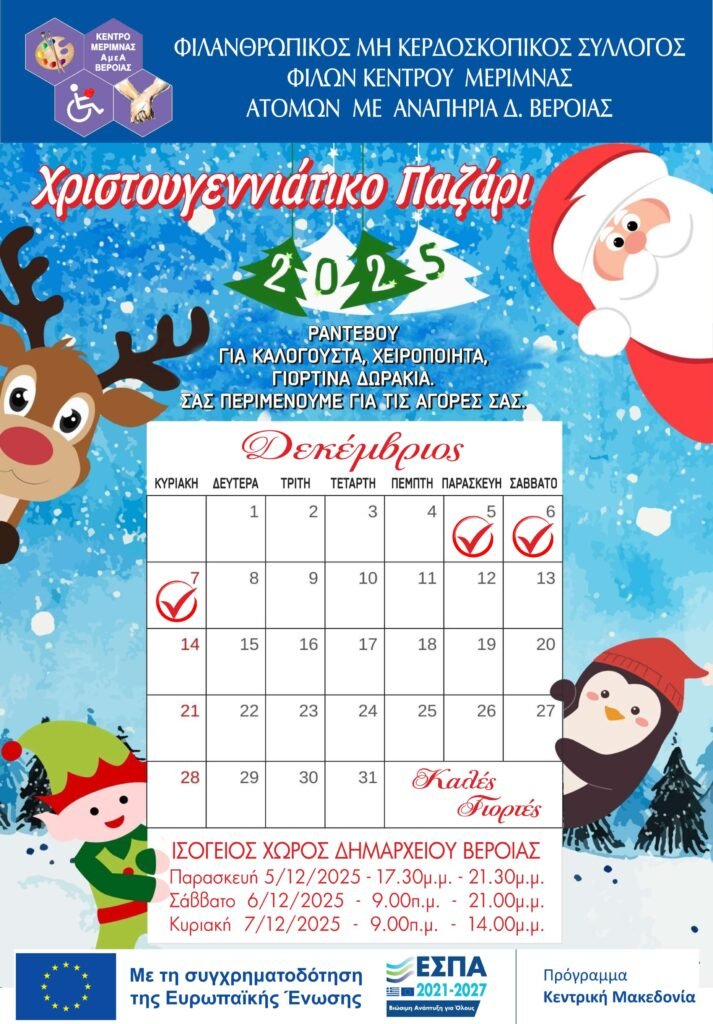 ΑΝΑΚΟΙΝΩΣΕΙΣ Πρόσκληση στο Χριστουγεννιάτικο Μπαζάρ 2026 Το τριήμερο Χριστουγεννιάτικο Μπαζάρ μας ξεκινάει σήμερα και η μαγεία των γιορτών πλημμυρίζει τον Ισόγειο Χώρο του Δημαρχείου Βέροιας! Σε μια ζεστή, γιορτινή ατμόσφαιρα, σας περιμένουν χειροποίητα στολίδια, ξεχωριστά δώρα και μοναδικές δημιουργίες φτιαγμένες με πολλή αγάπη από τους ωφελούμενους και την ομάδα μας. Ελάτε να στηρίξετε το έργο […]