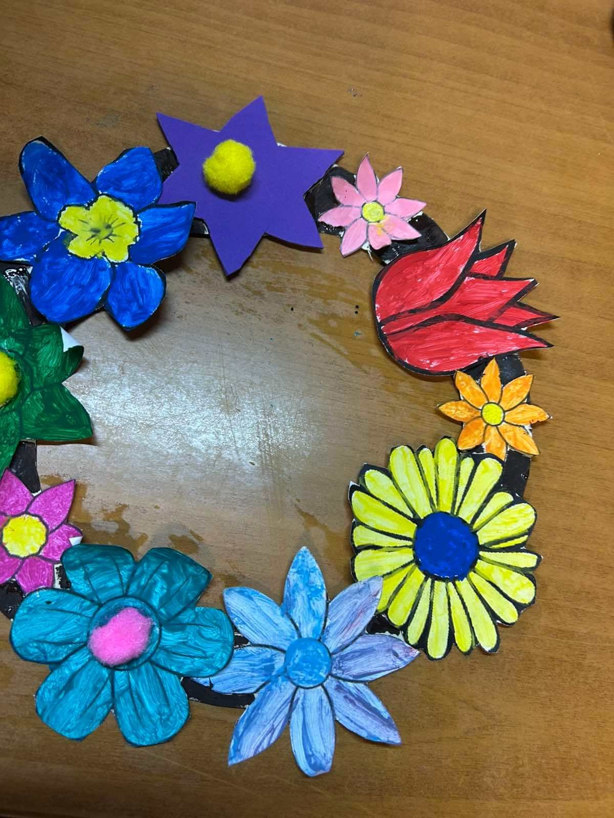 Υποδεχόμενοι την άνοιξη, δημιουργήσαμε ένα ανοιξιάτικο στεφάνι. Ακολουθώντας οργανωμένα όλα τα στάδια της κατασκευής, επιλέξαμε λουλούδια, τα χρωματίσαμε, τα κόψαμε και τα τοποθετήσαμε στη σωστή θέση πάνω στη βάση.