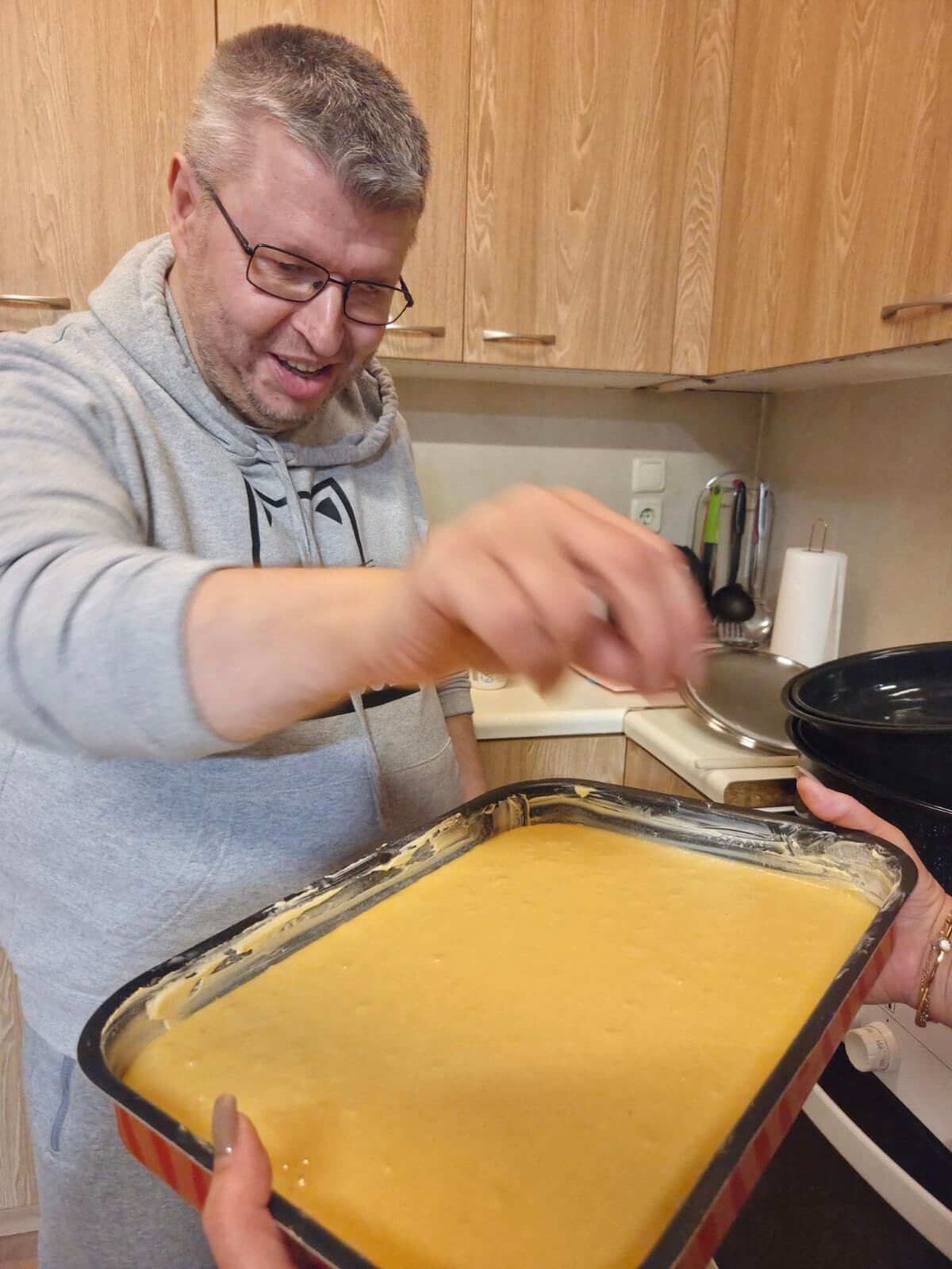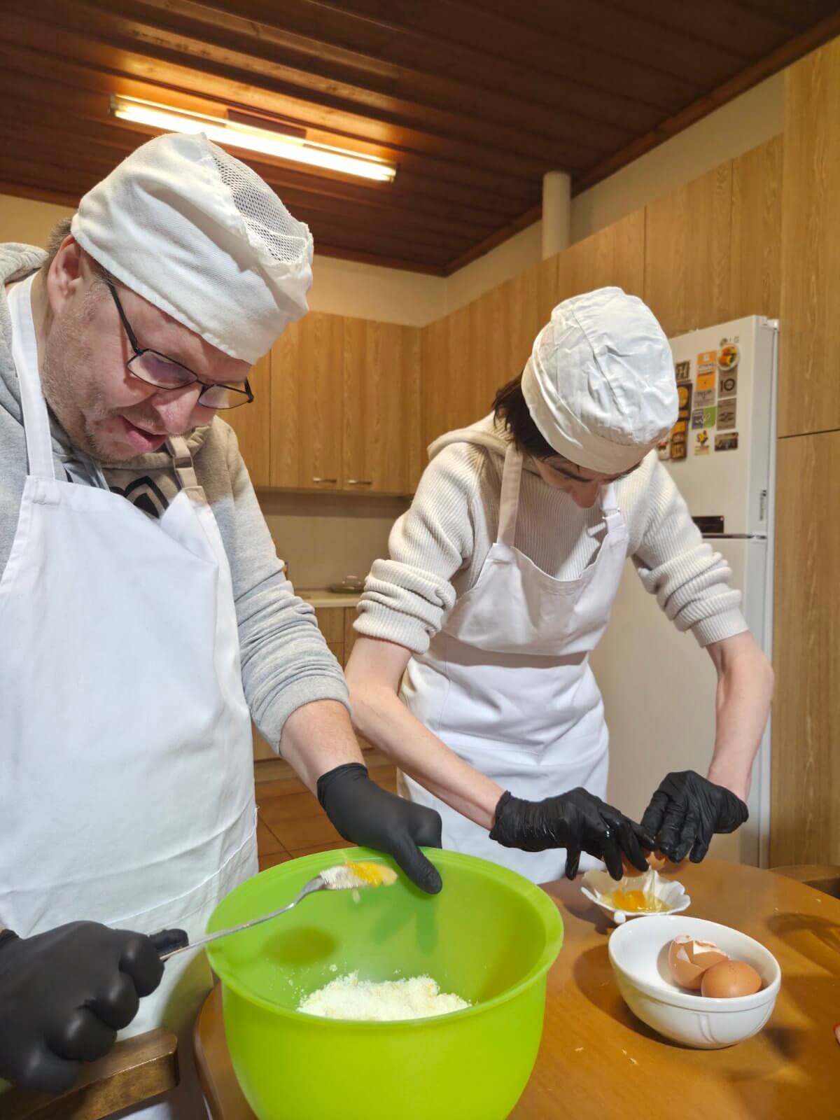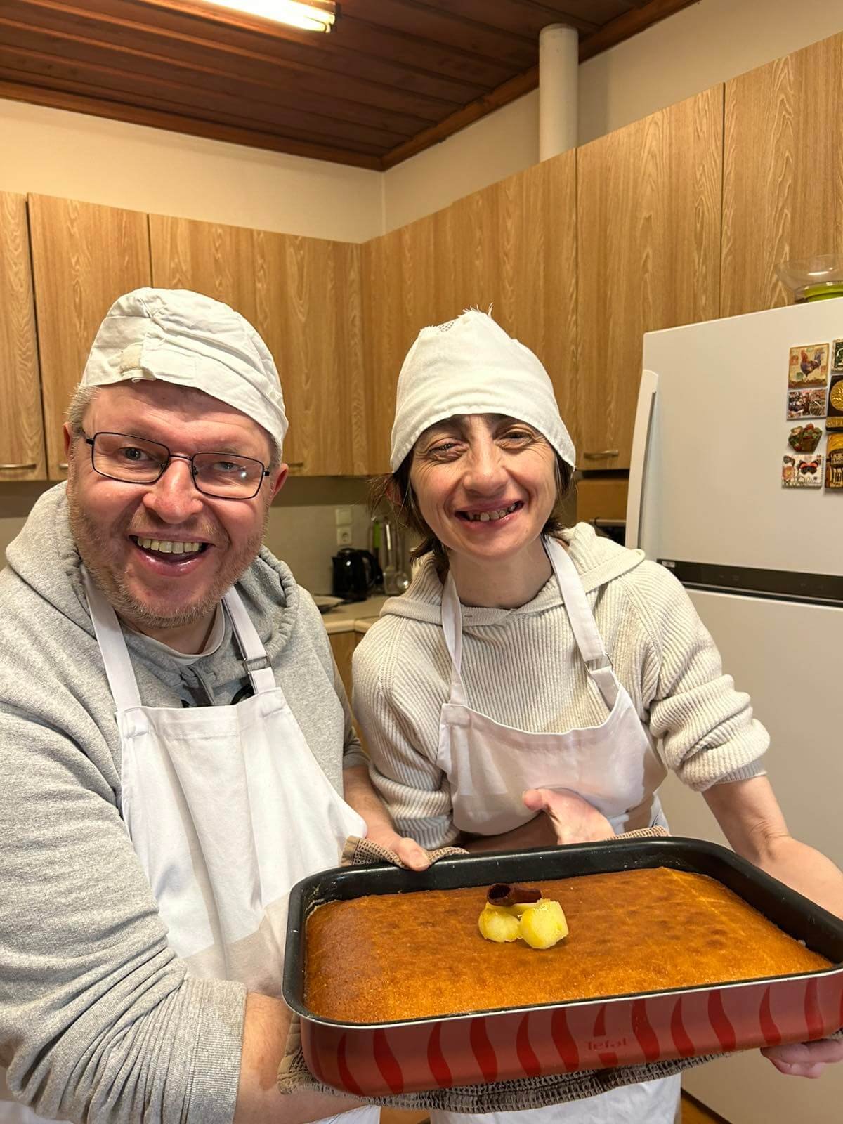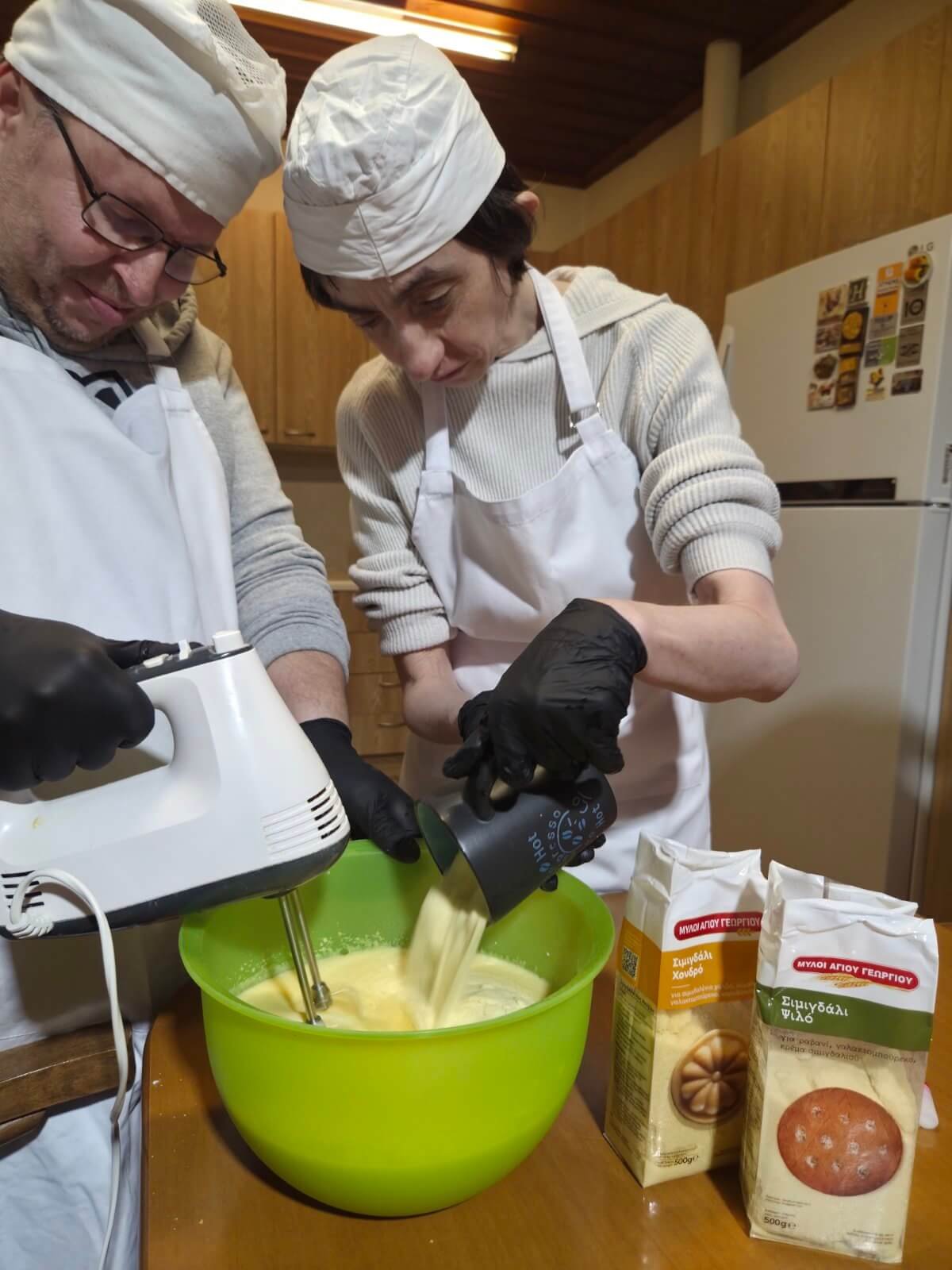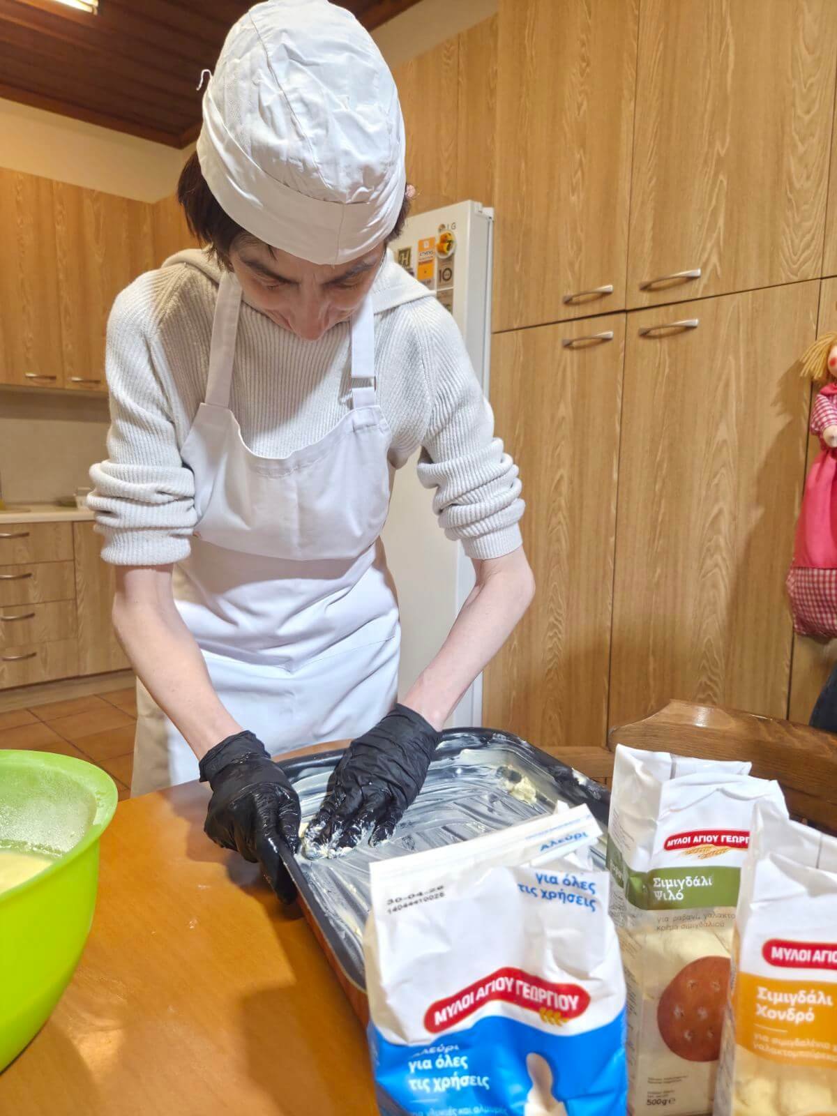 Συμμετείχαμε οργανωμένα σε όλα τα στάδια της διαδικασίας: μετρήσαμε τα υλικά, αναμείξαμε σιμιγδάλι και αλεύρι και ακολουθήσαμε τη σειρά των βημάτων έως την ολοκλήρωση του ψησίματος.