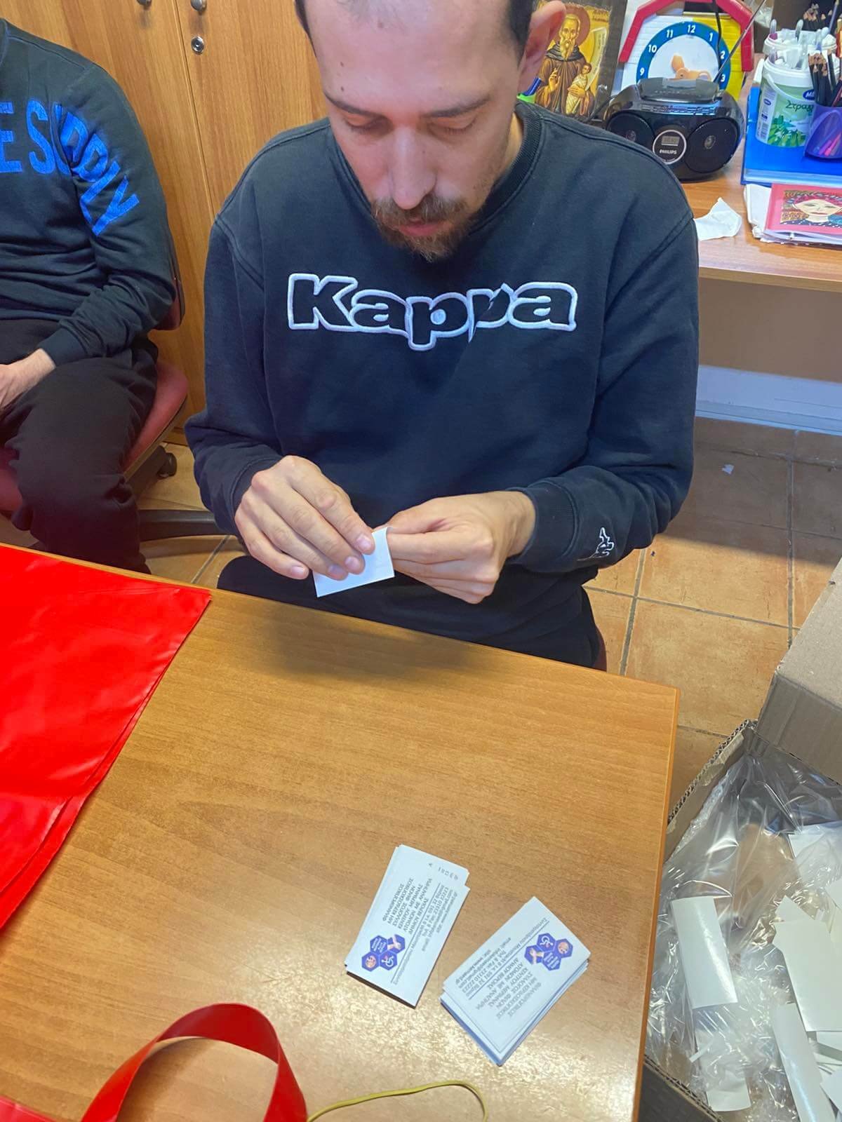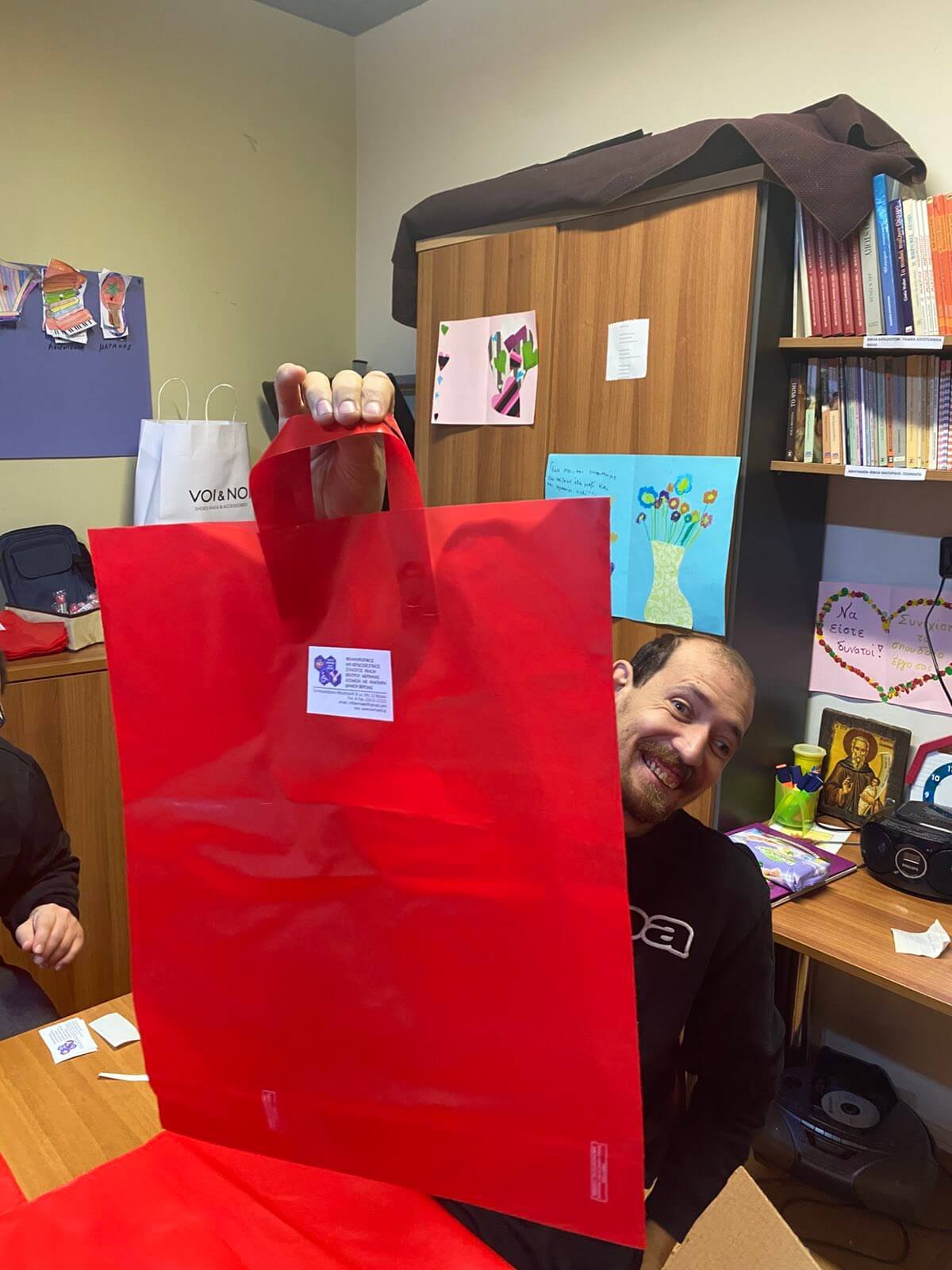 Αφού ολοκληρωθούν οι κατασκευές, τοποθετούνται προσεκτικά σε σακούλες δώρων, πάνω στις οποίες κολλάμε καρτελάκια με την ονομασία του Κέντρου μας.